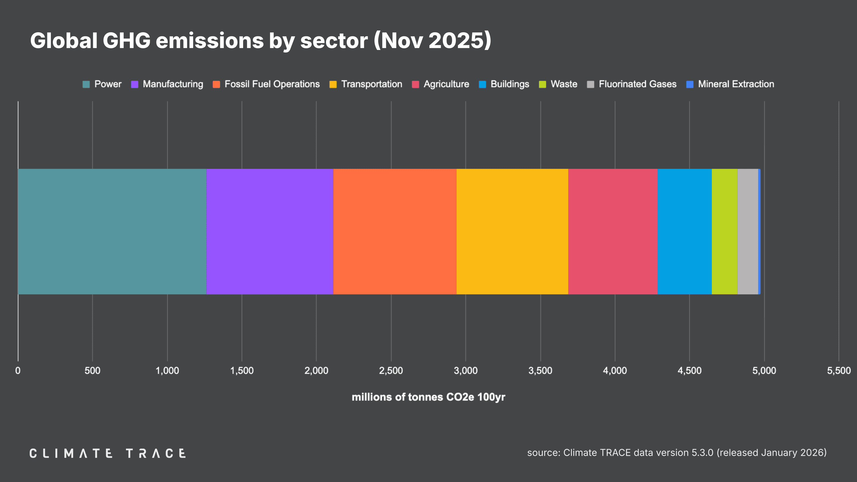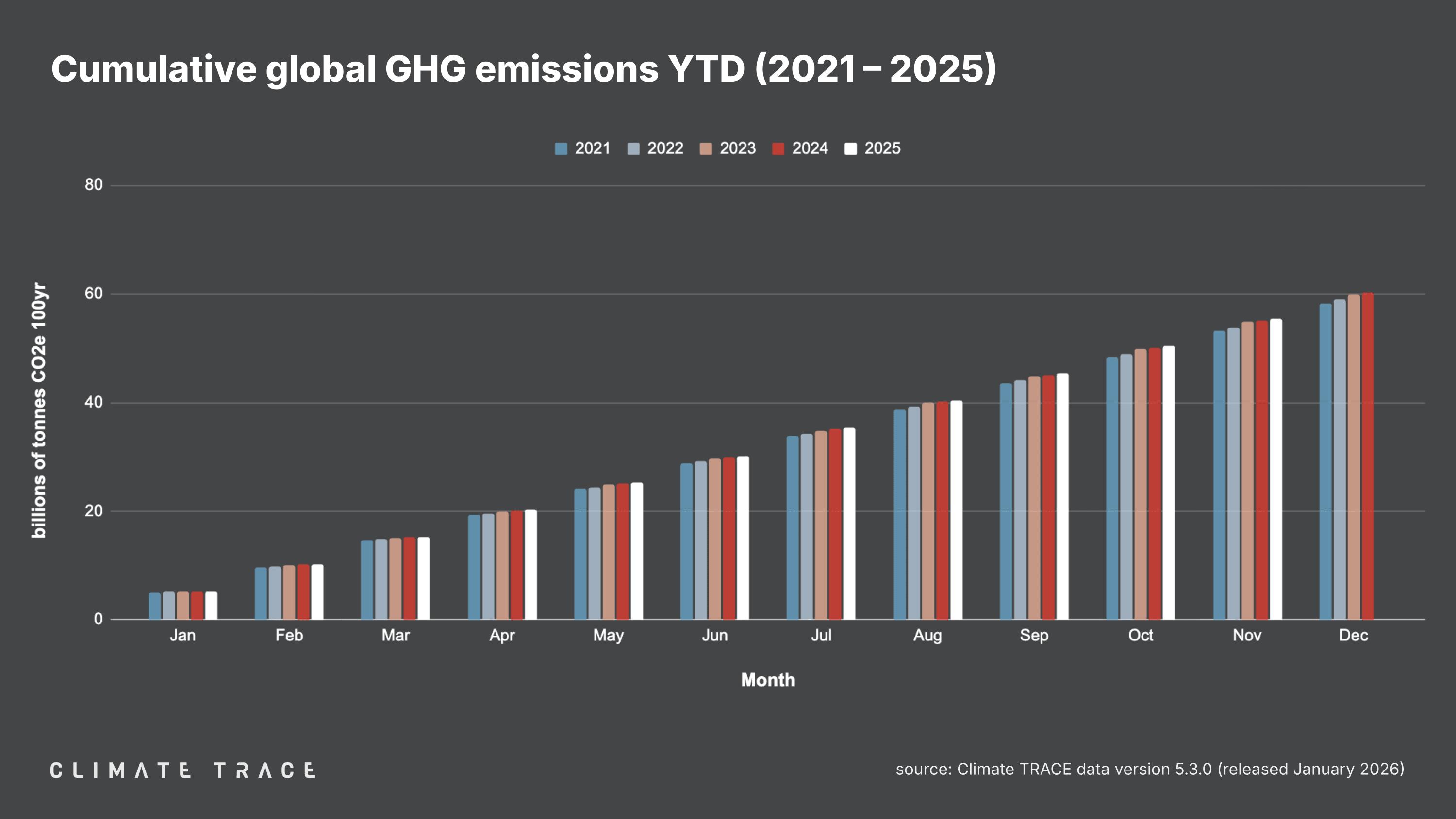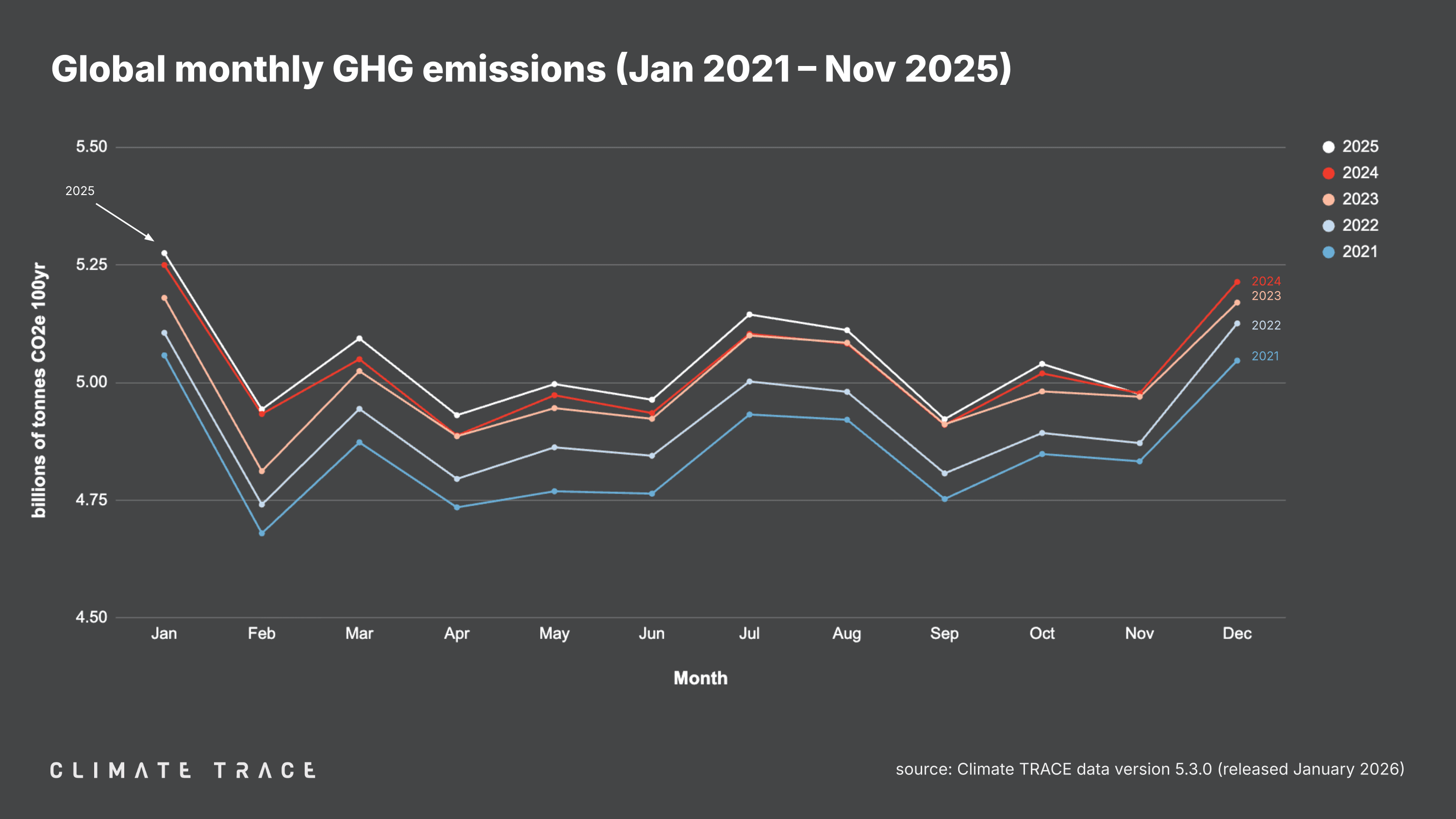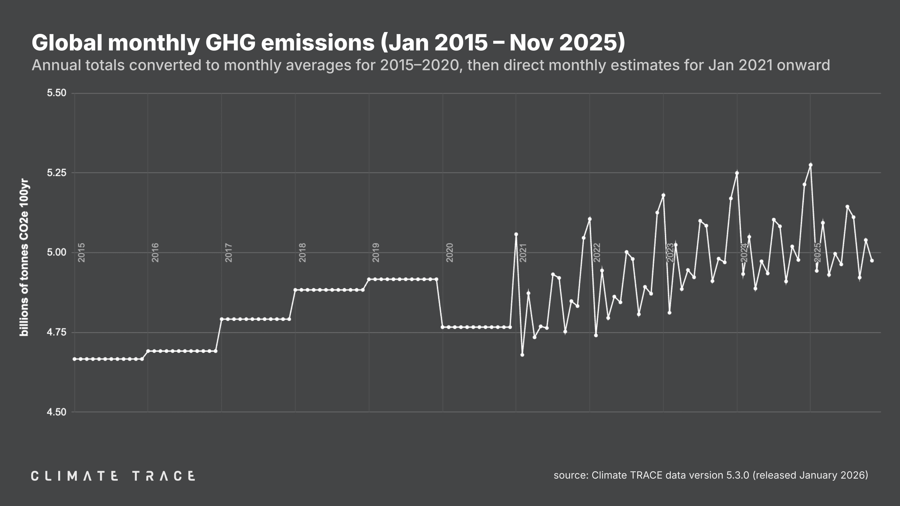 January 29, 2026 -- Today, Climate TRACE reported that global greenhouse gas (GHG) emissions for the month of November 2025 totaled 4.98 billion tonnes CO₂e. This represents a decrease of 0.04% vs. November 2024. Total global year-to-date emissions are 55.39 billion tonnes CO₂e. This is 0.50% higher than 2024's year-to-date total. Global methane emissions in November 2025 were 33.38 million tonnes CH₄, an increase of 0.05% vs. November 2024.